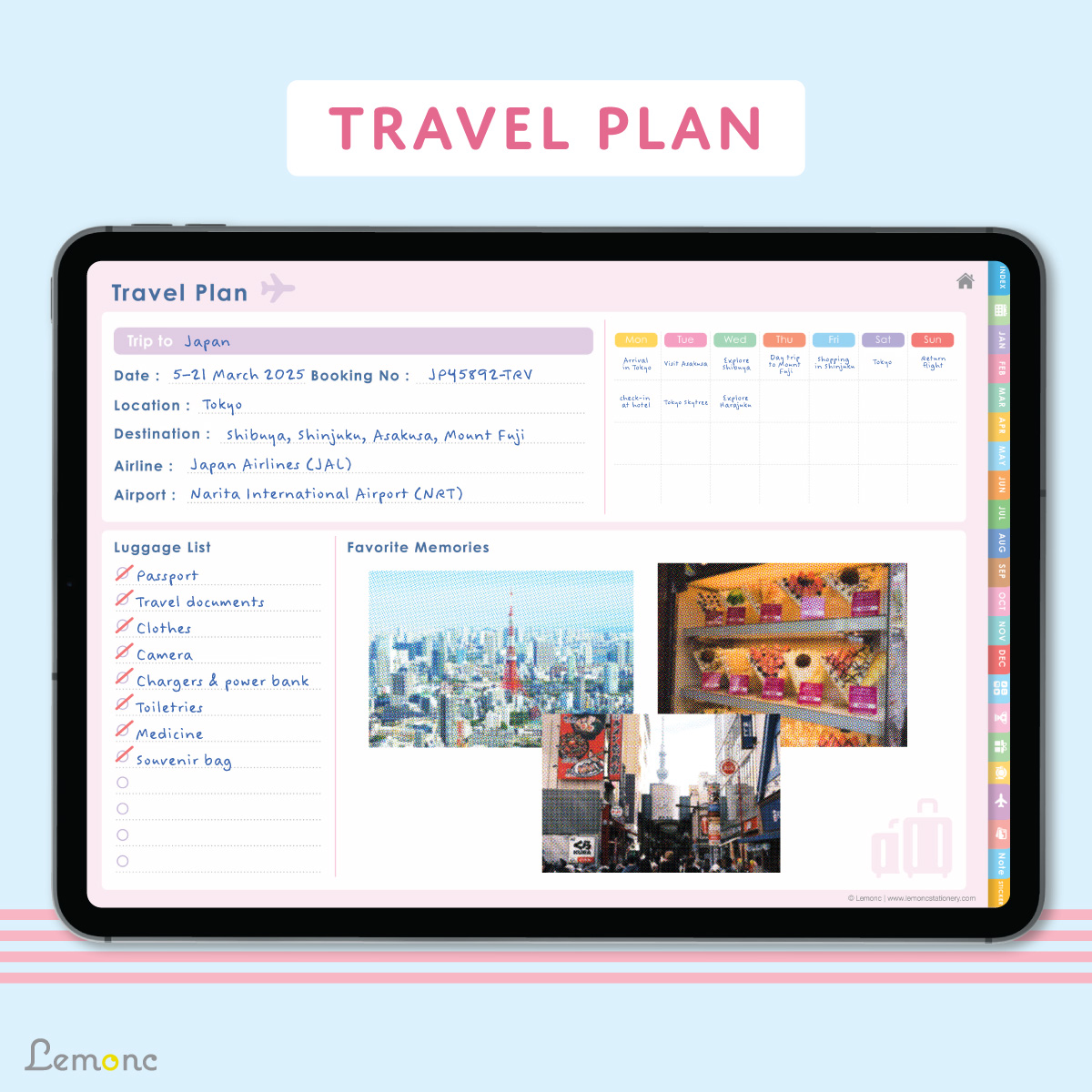 สำหรับวางแผนทริปท่องเที่ยว โดยสามารถเขียนรายละเอียด จุดหมายปลายทาง รายการของที่ต้องเตรียม และพื้นที่สำหรับใส่รูปหรือบันทึกความทรงจำ
