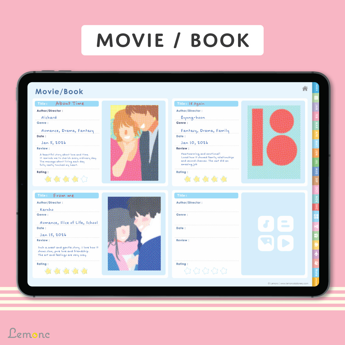 สำหรับจดบันทึกภาพยนตร์ ซีรีส์ หรือหนังสือที่ชอบ พร้อมพื้นที่ให้เขียนรีวิวและให้คะแนน -